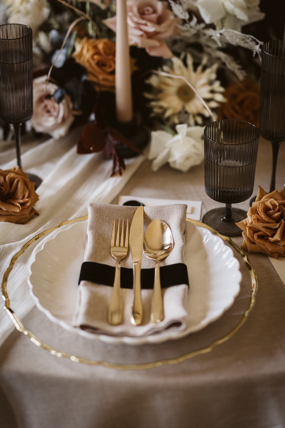 Nothing beats textured styling in the colder months. Layered table fabrics such as linen and chiffon like here, created an impactful base and added warmth and texture to an otherwise blank tablecloth. We teamed this with contrasting black smoked glassware with a ribbed finish to introduce another textured look into the table decor and offset the black velvet ribbon on the napkins perfectly!