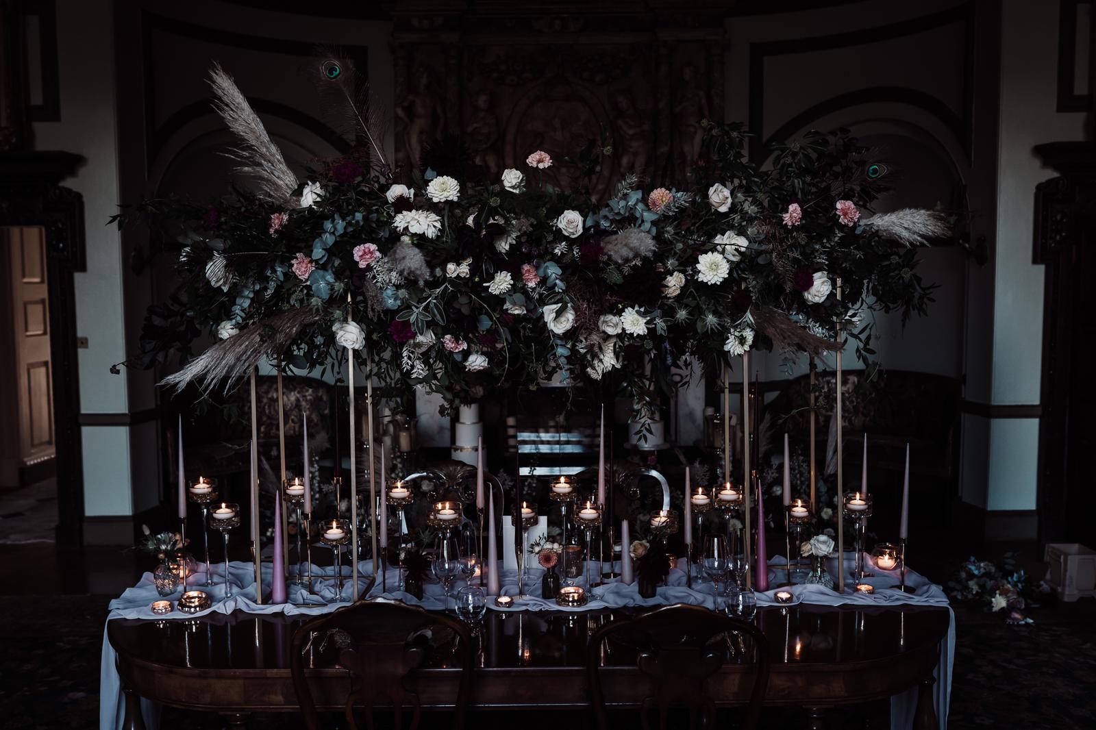 Our Ambience Harrogate and North Yorkshire stylist, Amy teamed up with Wellies and Wifi and a talented team of wedding suppliers to create a vision that delivered opulence, drama and beauty. Using a mainly neutral colour palette with accents of burgundy and pink, textures were then introduced by using mixed foliage and pampas grass. Candlelight was the order of the day and once lit the atmosphere in the room intensified with a romantic glow throughout.