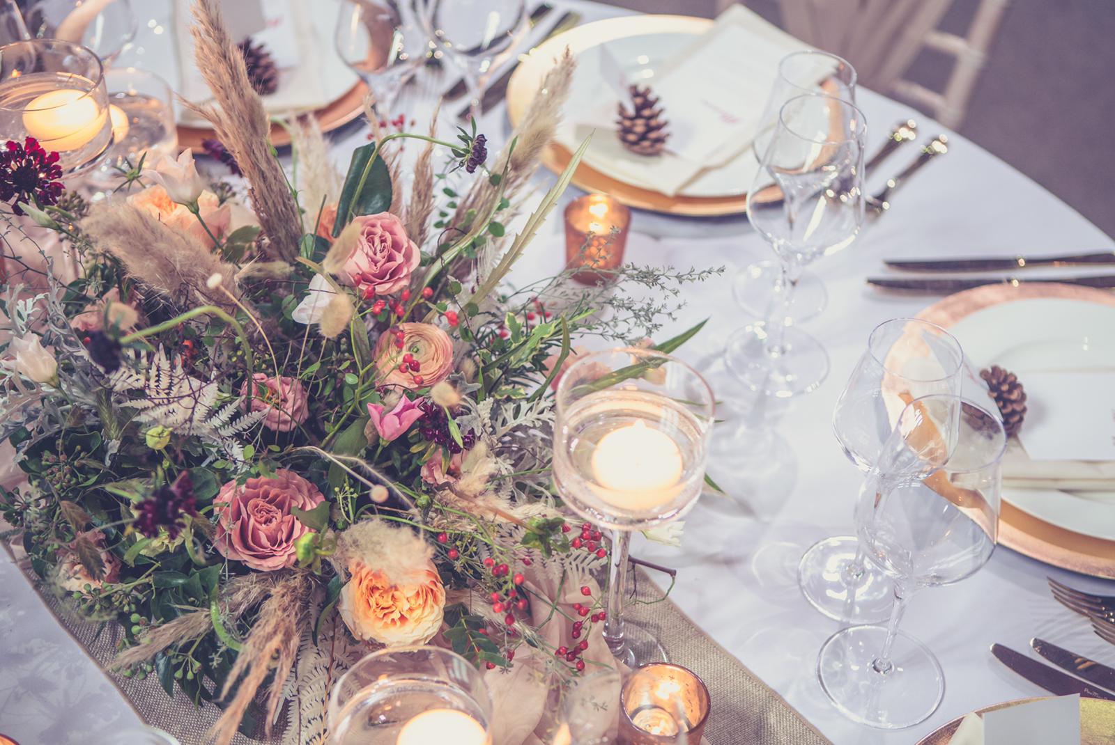 “We opted for typically autumnal colours – soft apricots, rusts, delicate pinks and a little white to visually soften… and a tiny touch of blue to link to the bridesmaids’ dress and accent colour on the napkins.”