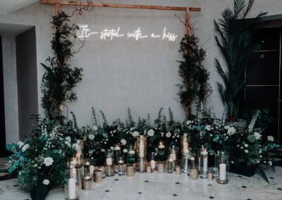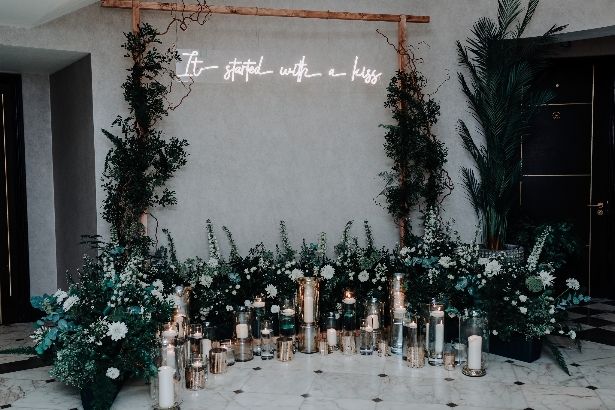 The main focal point was to be created downstairs and we wanted to create a design led and impactful area where the guests could have their photo taken with Jenny Packham. Charlotte very kindly agreed to have a new neon sign commissioned just for this event which is the name of the collection, “it started with a kiss” – truly stunning!