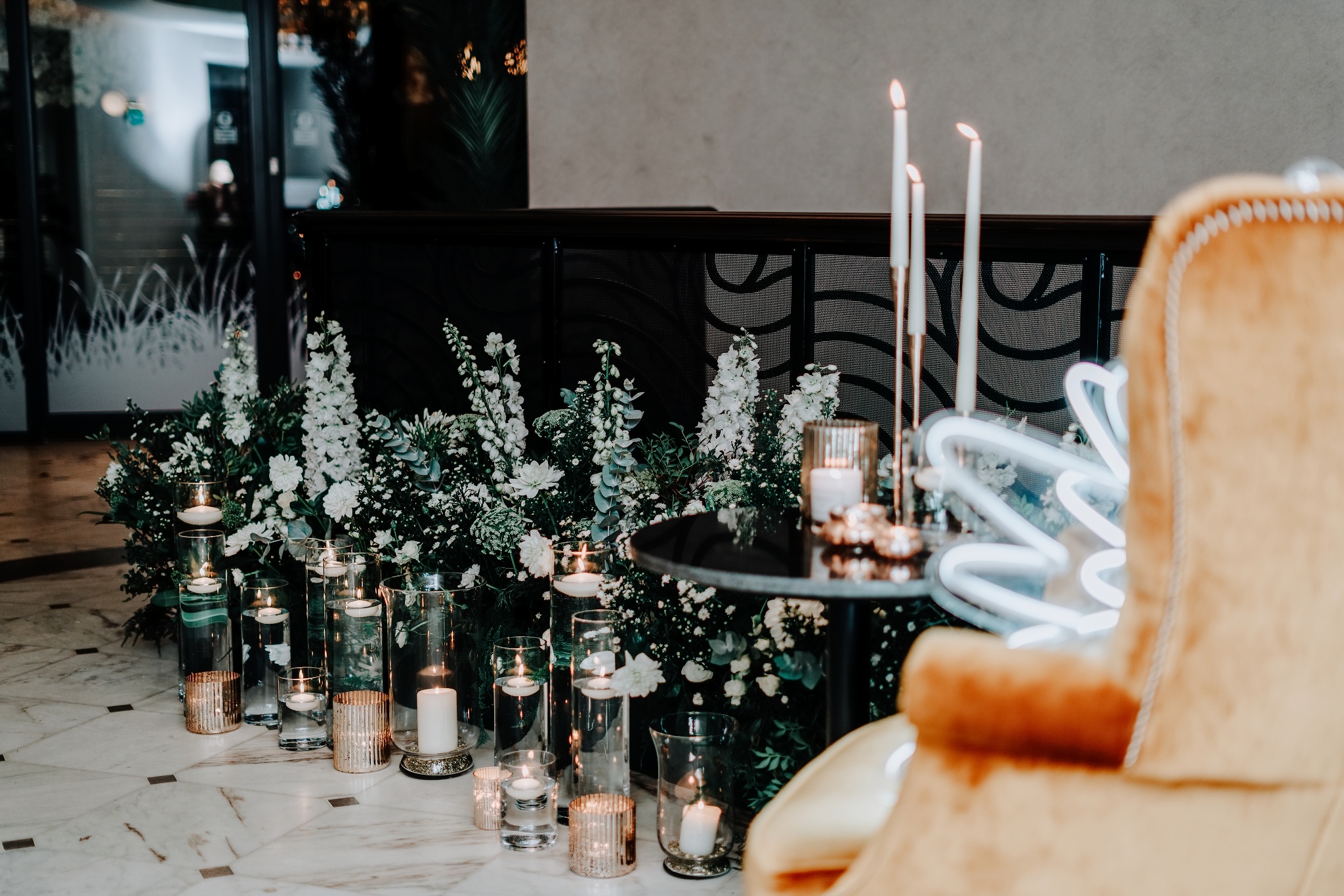 As you entered the main foyer, you were greeted by a large living wall, surrounded with lush foliage and bespoke made Jenny Packham sign created by Love Lights The Way. Victoria created a stunning wild meadow, keeping it classic with lots of foliage and pops of cream flowers which ran the full length of the staircase! To sit in and amongst the meadows we accessorised with large clusters of candlelight, varying height cylinder vases with both pillar and floating candles and lots of gold mercury votives.