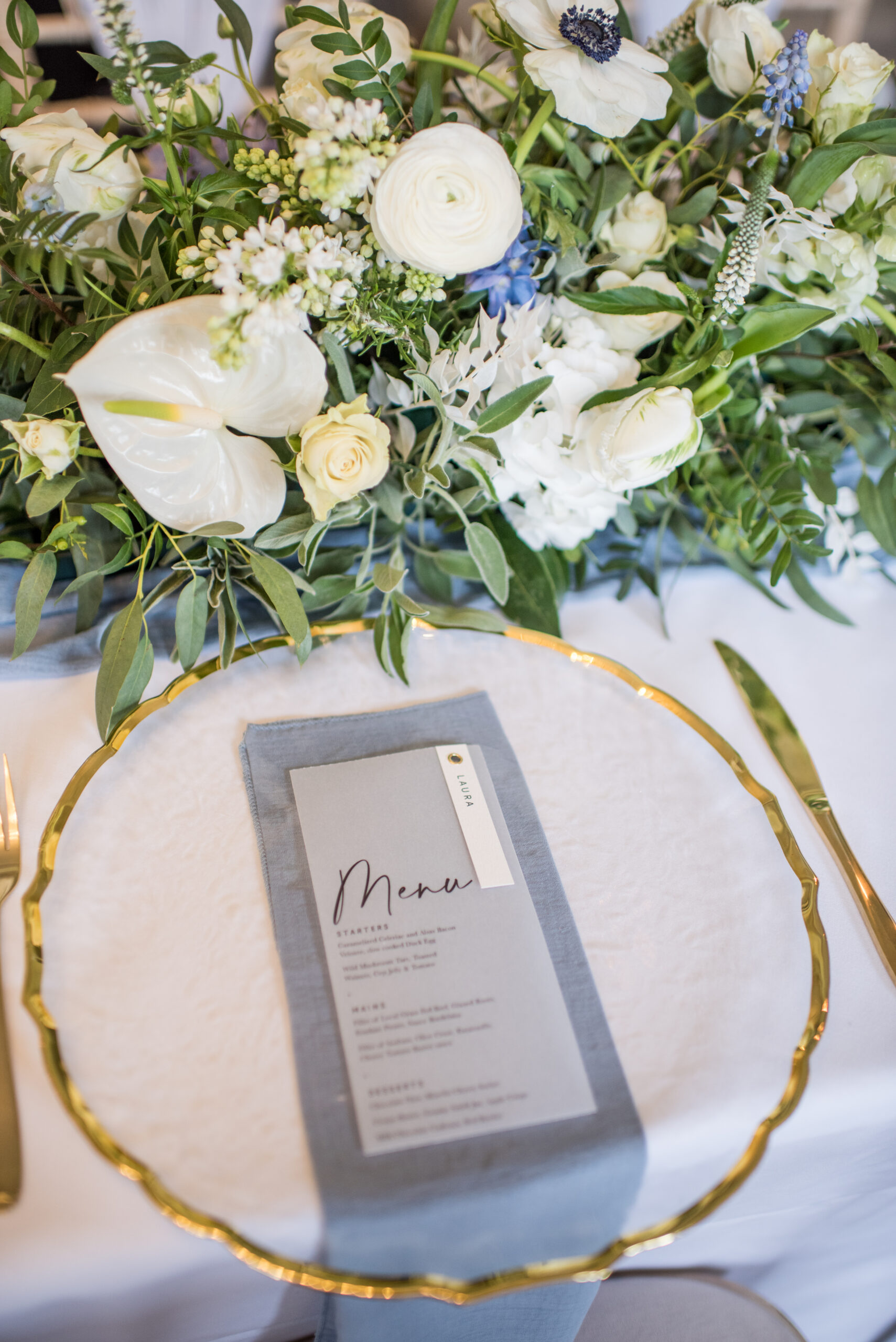 We added contrasting linen napkins and a full length table runner in dusty blue cheesecloth fabric which was then layered with muted gold and clear candle holders in varying sizes. Laura from Mint and Moose Floral Design created stunning arrangements that featured scabious, muscari, eucalyptus, hydrangea, ranunculus and mixed these in with meadow inspired blooms to literally create a floral dream!