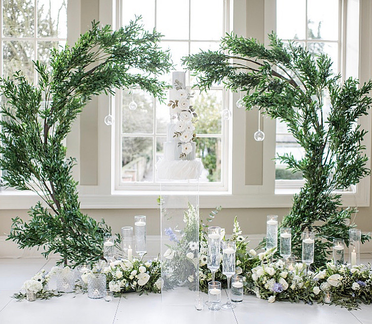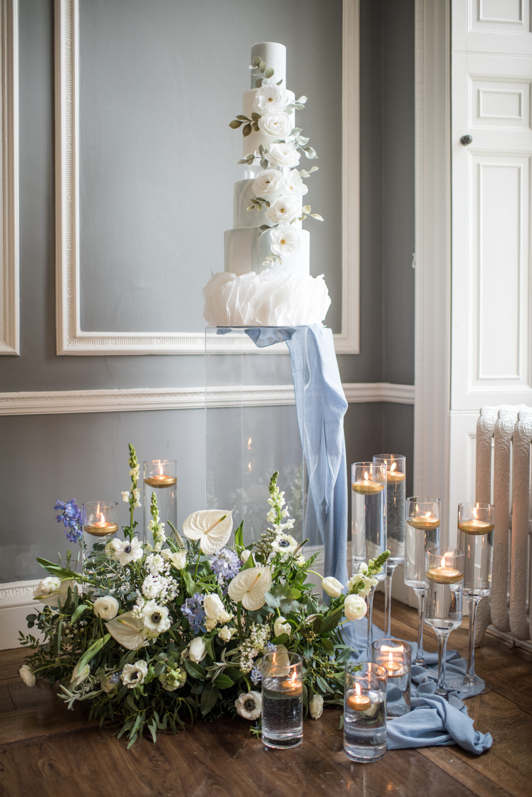 The most stunning wedding cake featuring intricate handmade flower heads designed by Poppy Pickering was positioned on an acrylic pedestal to give the appearance of the cake floating in the corner of the room. We staged this with florals and candlelight at the base to enhance and highlight with mood lighting and contrasting colours.
