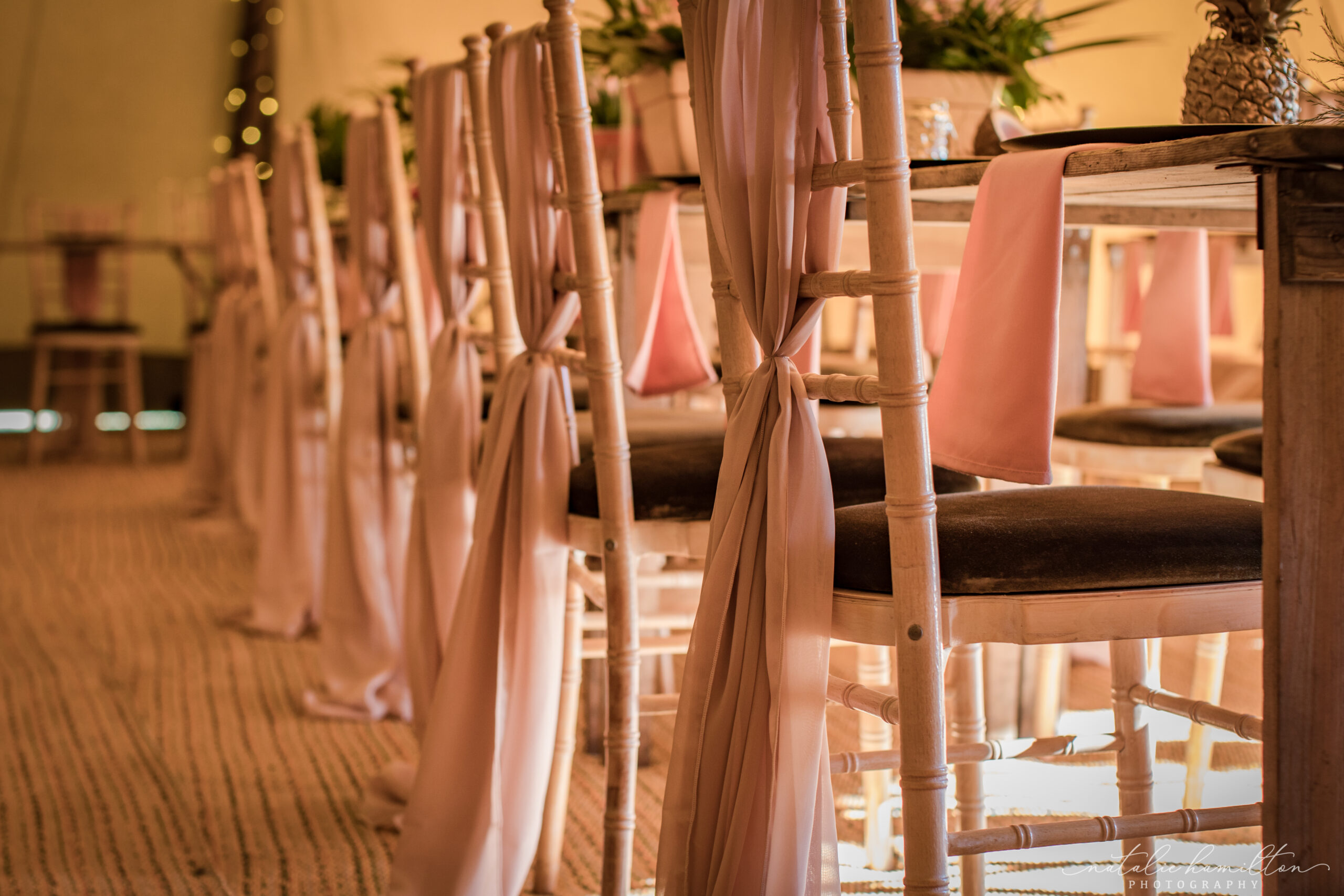 The most popular, on trend chairs for marquee and tipi weddings are wooden cross backed chairs which can be styled with chiffon drapes, foliage or floral details to soften the look. There’s also Chiavari/Camelot chairs, folding chairs or rustic benches which are all great choices.
