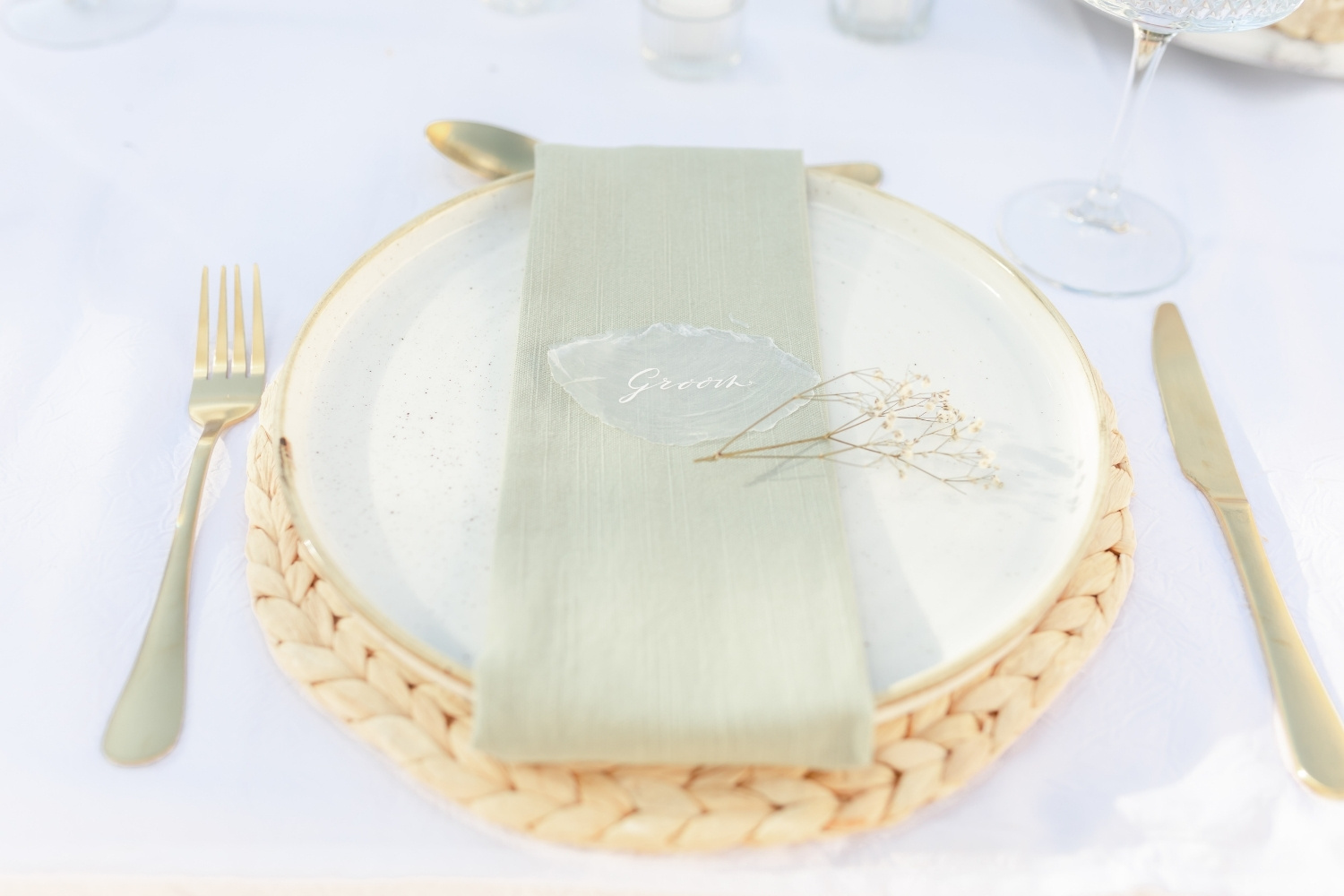 The use of texture at outdoor weddings can be really effective as a subtle nod towards the ruggedness of the surroundings. It adds depth and intrigue on a visual level for your wedding guests. Place mats are a great option to define settings with water hyacinth place mats fast becoming a popular choice with couples. Layered with a contrasting linen like these beautiful sage napkins, you can create beautiful tables with carefully thought out decor pieces.
