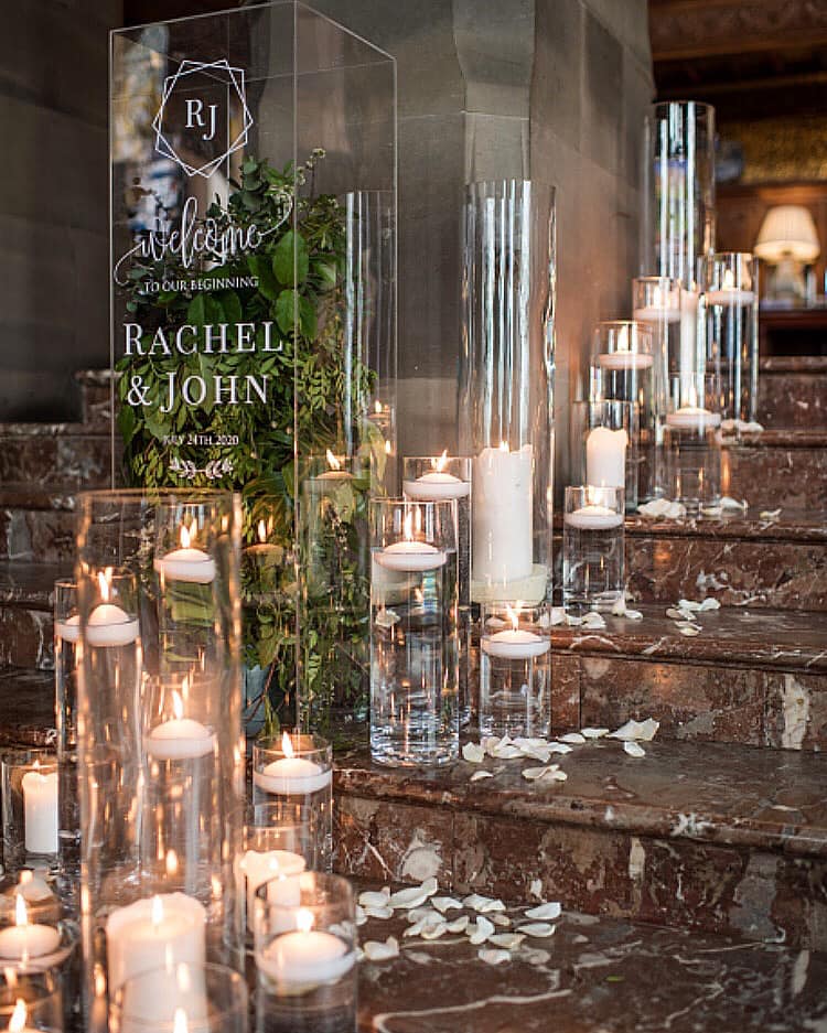 If your venue has a narrow staircase and you want to avoid any accidents such as your wedding dress catching the candlelight on your way down then don’t worry, there’s still lots you can do! Try fairy lights up the bannister as a more practical solution, providing a magical look right into the late evening. Alternatively if there’s open space to work with at the bottom of your staircase then create feature base decor to enhance the staircase with floral arrangements, candlelight, custom made neon signs or uplighters.