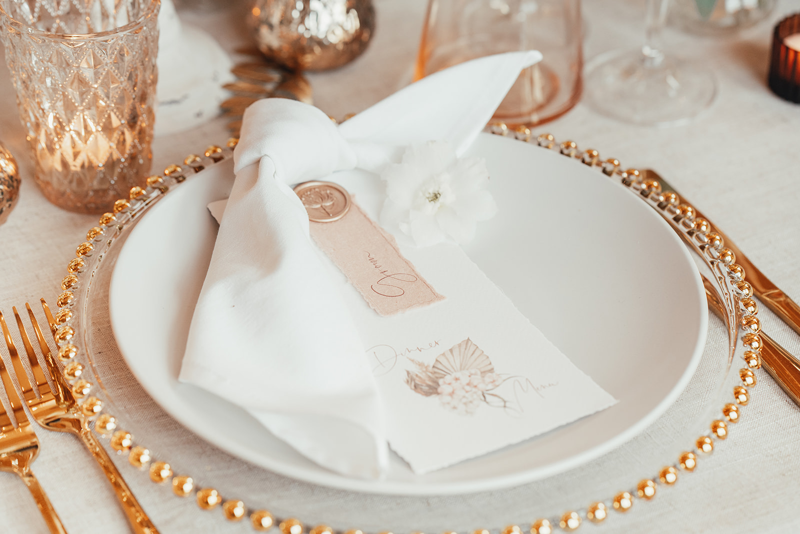 Top tip – Selecting key feature pieces to style out your look such as this incredible floral moongate, are a great way to add impactful texture and make a statement. This allows you to opt for more minimalist, neutral decor for other areas such as your table decor.