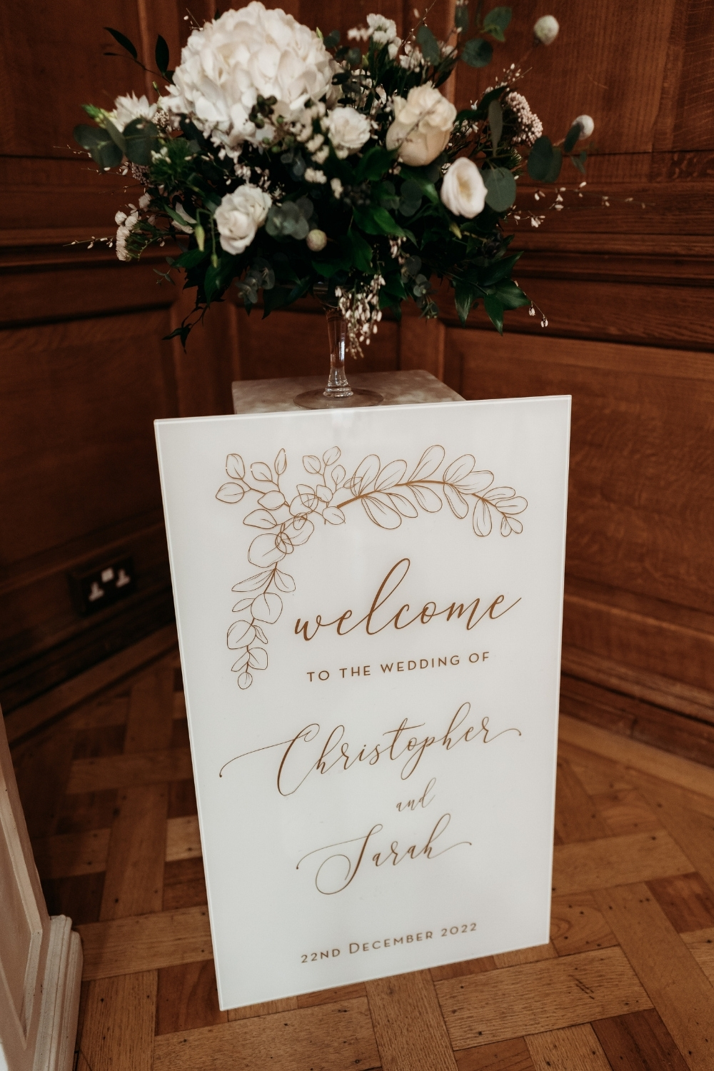 Greet your guests with a personalised welcome! We love this white acrylic signage with gold calligraphy font which fits into the styling seamlessly and offers guests a glimpse of what’s to come when the doors open! Now where’s that champagne, let’s get the festive season underway!