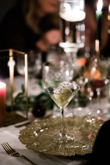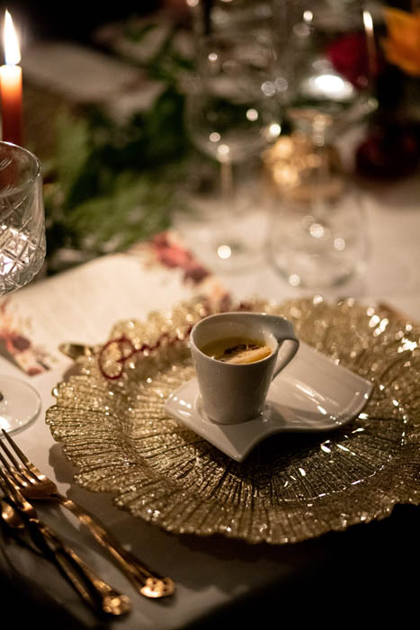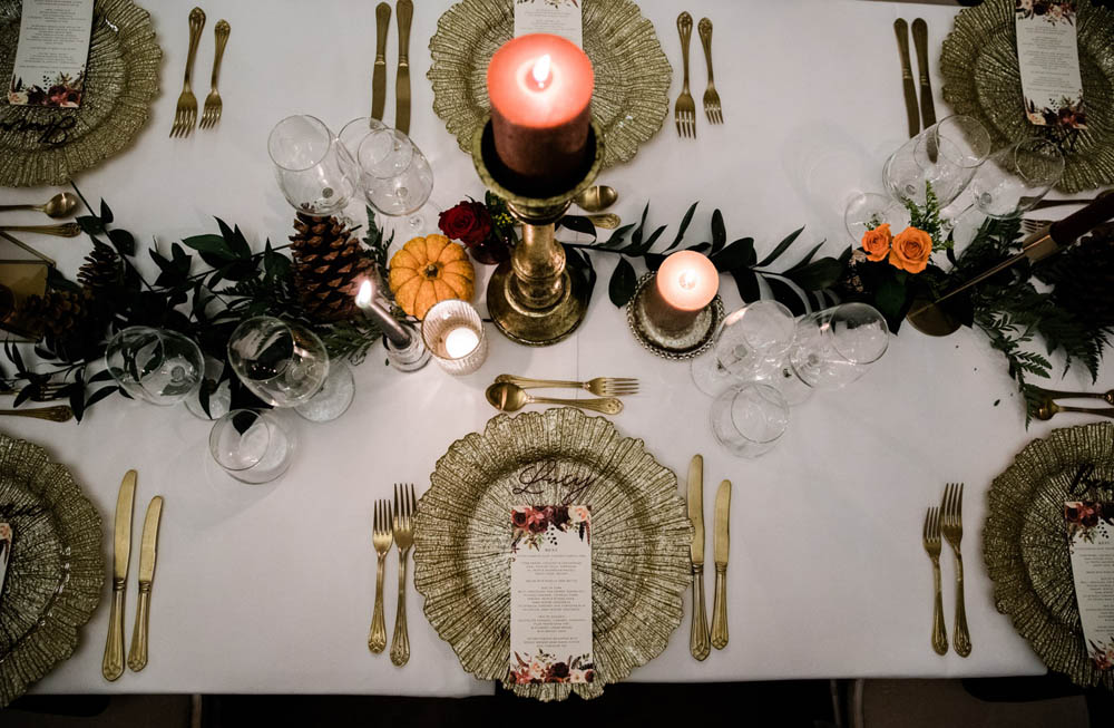For the table setting we created an opulent tablescape to extend the length of the full table using varying heights of accessories, candlelight and florals. We used a rich colour palette of burnt orange, deep burgundy and foliage to add warmth to the styling and incorporated miniature pumpkins and pine cone details all interspersed amongst ruscus. The place settings were then layered up with autumnal inspired menu cards featuring the 6 course menu lovingly prepared by Matthew Hyde from BabaGanoush Catering. The food was incredible!