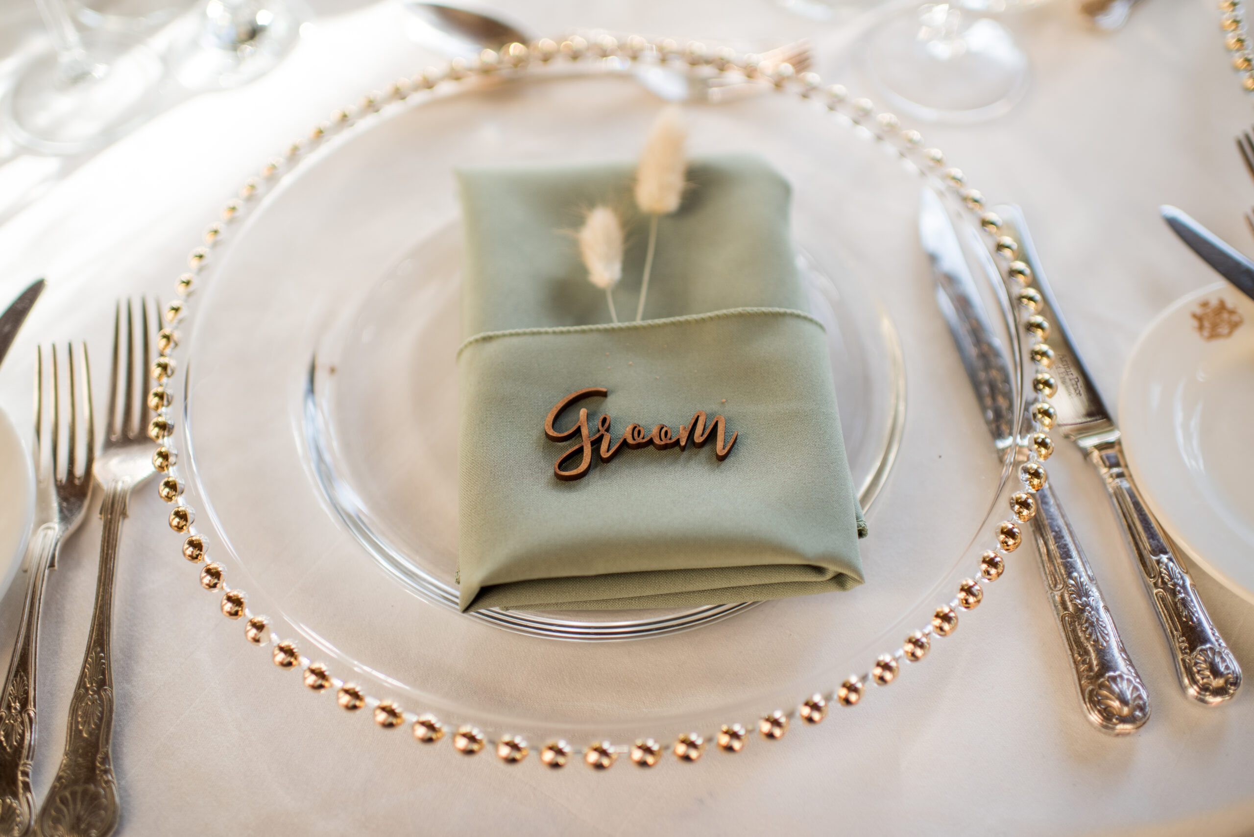 Add to this your beautifully folded napkin with personalised wedding stationery – perhaps a menu card neatly presented on top of the napkin or with your place names positioned accordingly.