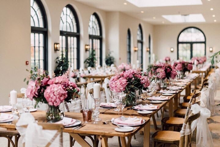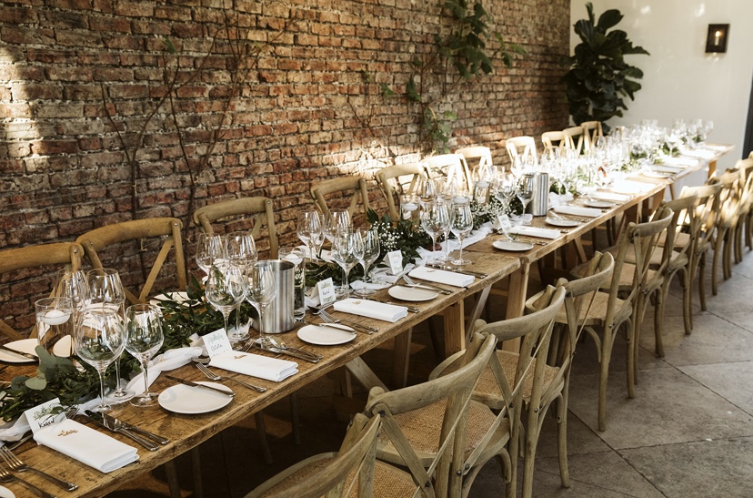Exposed brick walls and contemporary settings are the perfect opportunity to harmonise with the natural stone work and bring in elements of greenery alongside a timeless neutral such as white or ivory. Adding a pop of statement colour can also really make it your own like this deep pink seen at Middleton Lodge.